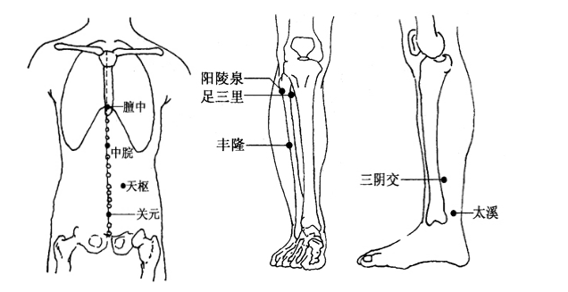 (1)選穴 膻中,中脘上下部位、臍周、天樞、關元、腎俞、三陰交、豐隆、足三里。
