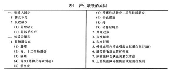 人體內(nèi)的鐵是呈封閉式循環(huán)的。正常情況下,鐵的吸收和排泄保持著動態(tài)的平衡,人體一般不會缺鐵,只在需要增加、鐵的攝入不足及慢性失血等情況下造成長期鐵的負(fù)平衡才致缺鐵。造成缺鐵的病因可分為鐵攝入不足和丟失過多兩大類(表1)。