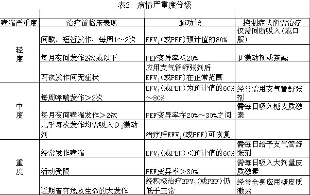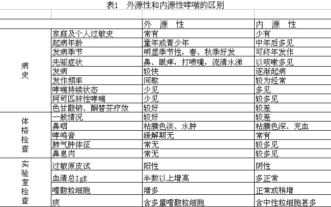 (二)分型 根據病史、癥狀、體征和實驗室檢查結果的特點,臨床上將哮喘分為外源性哮喘和內源性哮喘兩型(表1)。
