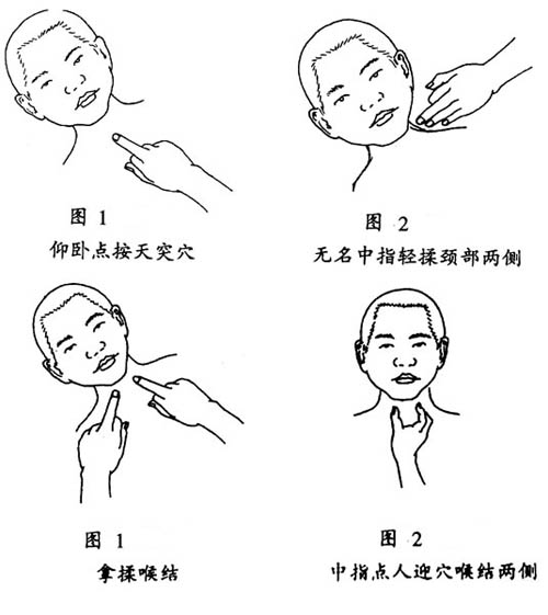 (2)患者仰臥,施術者以雙手中指指腹點按人迎穴、水突穴、氣舍穴、天突穴、廉泉穴、承漿穴、印堂穴、百會穴,每穴約1-3分鐘;再以無名指和中指指腹輕輕按揉頸部肌膚,以咽喉部為主,時間約3-8分鐘;以拇指指腹點按胸部膻中穴、腹部關元穴(臍下正中線上四橫指處),每穴約1-3分鐘,再以手掌由上向下沿胸部正中線推按10-30次;較后用雙手拇指點按足底涌泉穴、太溪穴(內踝尖和跟腱間中點處),每穴約3-5分鐘。(如上圖)