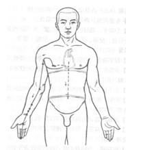 它的支脈:沿胸內出脅部砭石,當腋下三寸處(天池),向上到腋下,沿上臂內側(天泉),行于手太陰經、手少陰經之間,進入肘中(曲澤),下行于前臂內側,走兩筋(橈側腕屈肌腱與掌長肌腱)之間(郄門、間使、內關、大陵),進入掌中(勞宮),沿中指橈側出于末端(中沖)。