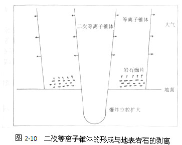 1.二次等離子錐的形成與地表巖石的剝離(圖2-1O)。隕星在地下爆炸后爆炸空腔擴(kuò)大,爆炸產(chǎn)物沖入地表上空已形成等離子體的空間再次形成高溫高壓等離子錐體。此時(shí),到達(dá)地表的巖層中的固體沖擊壓縮波經(jīng)地表自由面反射砭石,形成稀疏波,地表巖層在反射稀疏波的張應(yīng)力作用下產(chǎn)生脫痂效應(yīng)(Split effect),大量地表巖石成為痂片飛入高溫高壓等離子體中。