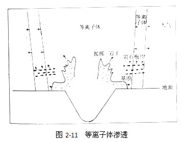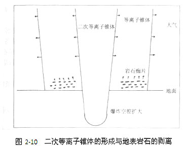 2.等離子體滲透(圖2-11)。拋入空中的巖石片在高溫高壓等離子體的蒸薰下,其內(nèi)滲入鐵質(zhì)隕星爆炸產(chǎn)物的多種元素。此時(shí),二次等離子錐體擴(kuò)展,追趕并接近一次錐體。爆炸巖土被拋入空中。近區(qū)地面產(chǎn)生基浪,以每秒幾十米的速度向四周傳播。