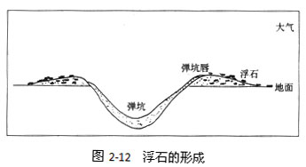 3.浮石的形成(圖2-12)。大量爆炸拋擲物下落,部分落入彈坑,部分形成彈坑唇。經(jīng)歷了沖擊變質(zhì),拋人空中在高溫高壓等離子體中吸收了隕星爆炸產(chǎn)物的灰?guī)r石片散落地面形成浮石,并在快速冷卻過(guò)程中形成微晶結(jié)構(gòu)。沖擊波與等離子體擴(kuò)散后,產(chǎn)生余風(fēng),升起蘑菇云,產(chǎn)生大面積的塵降。