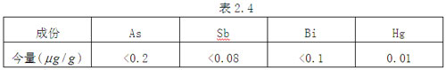 砷、銻、鉍、汞含量的檢測(cè)。核工業(yè)地質(zhì)分析測(cè)試研究中心對(duì)泗濱浮石(泗濱砭石)的砷、銻、鉍、汞含量的檢測(cè)結(jié)果如表2.4所示。