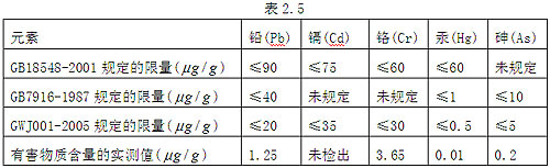 綜合上述2、3、4三項(xiàng)化學(xué)分析結(jié)果,泗濱浮石(泗濱砭石)中5種有害物質(zhì)鉛、鎘、鉻、汞、砷的含量的實(shí)測(cè)值與國家標(biāo)準(zhǔn)GB 18584-2001室內(nèi)裝飾裝修材料木家具中有害物質(zhì)限量條款4和GB 7916-1987化妝品衛(wèi)生標(biāo)準(zhǔn)條款2.3.2,以及企業(yè)標(biāo)準(zhǔn)GWJ 001-2005砭石和砭具標(biāo)準(zhǔn)條款5.1規(guī)定的有害物質(zhì)限量的對(duì)比,如表2.5所示。