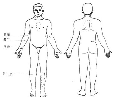 刺法:用砭石刮痧板的尖尾部點(diǎn)刺曲澤、郄門、內(nèi)關(guān)、足三里穴。