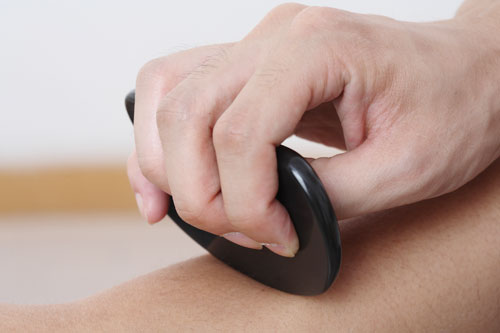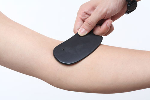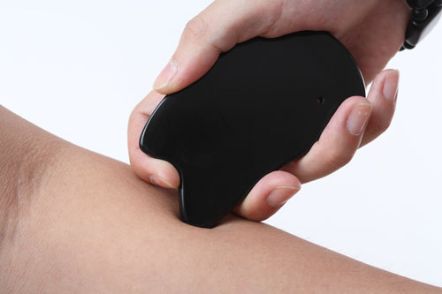 刮法:刮法是砭術(相關鏈接:《砭石使用》)操作(相關鏈接:《泗濱砭石操作手法》)手法之一,也是使用較為普遍的手法(更多砭石使用和砭石養生請查看砭石百科和砭石養生欄目)之一,通常運用砭石刮痧板結合刮法,疏通人體經絡(砭石使用結合穴位效果更佳,詳情請看砭石養生欄目),加速血液流通,達到平衡陰陽的目的。刮法以皮膚微紅為度,一般不出“痧”,更不要刮出皮下出血。有些熱病實證患者,輕輕刮拭很容易“出痧”,為調理(更多砭石使用和砭石養生請查看砭石百科和砭石養生欄目)中必然現象,說明熱(實)邪已從皮膚透出。