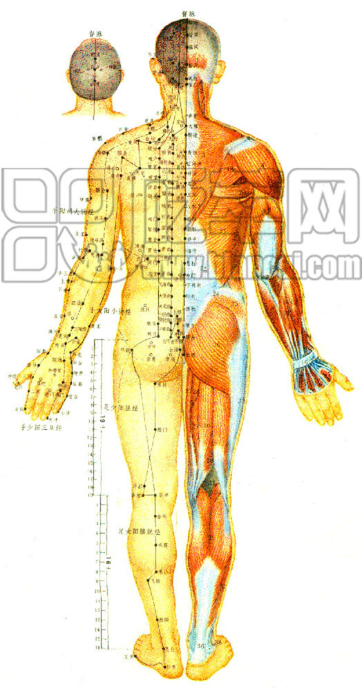 本圖左側半在皮膚上標示了手陽明大腸經、手少陽三焦經、手太陽小腸經、足太陽膀胱經、足少陽膽經和督脈的外行徑路以及與各經脈(砭石使用結合穴位效果更佳,詳情請看砭石養生欄目)相連的穴位(砭石使用結合穴位效果更佳,詳情請看砭石養生欄目)。此外,并選標了一些經外奇穴和新穴。