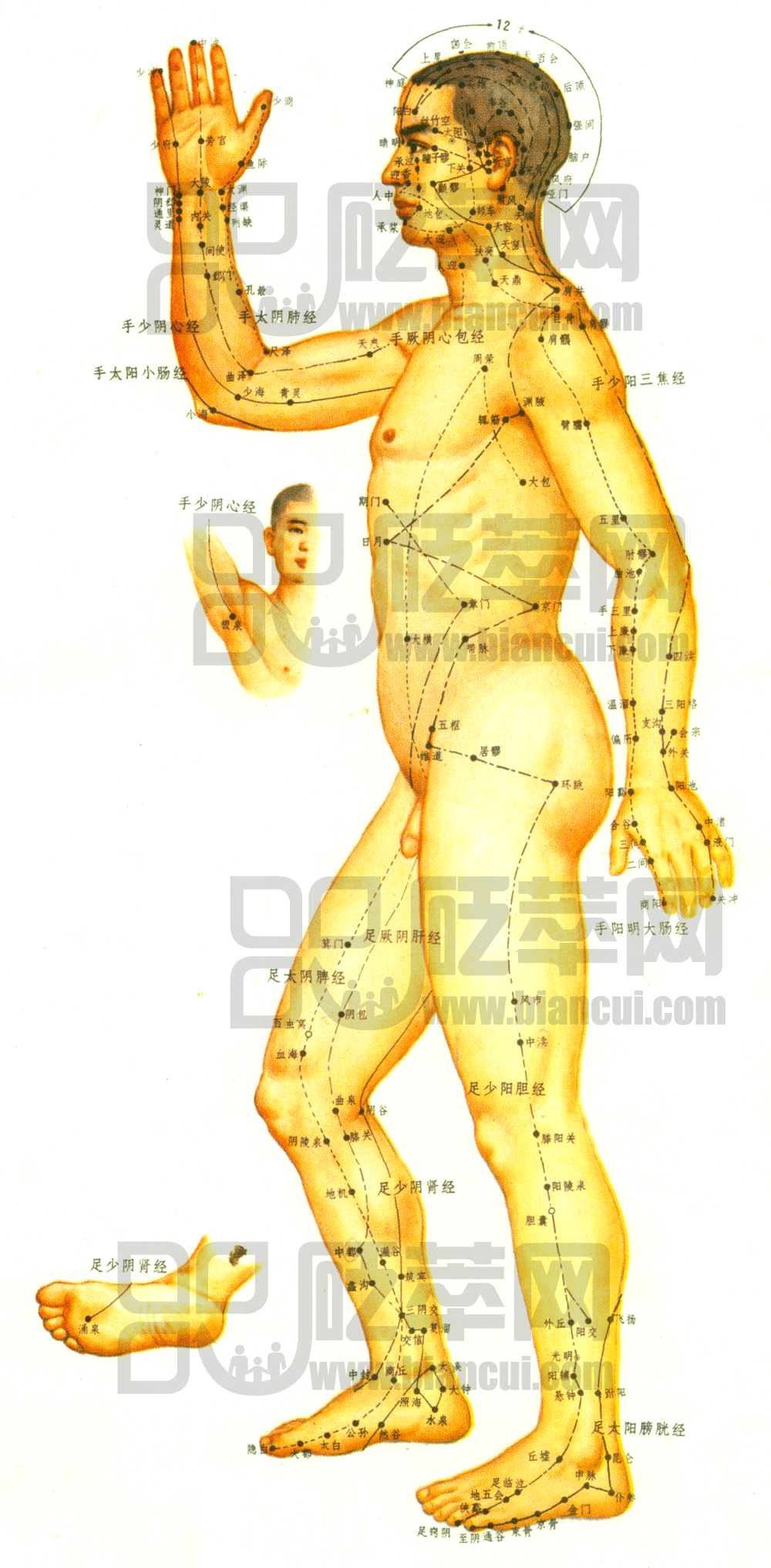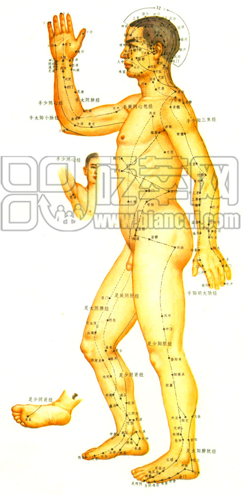 本圖在皮膚上標(biāo)示了手太陰肺經(jīng)、手厥陰心包經(jīng)、手少陰心經(jīng)、手太陽小腸經(jīng)、手少陽三焦經(jīng)、手陽明大腸經(jīng)、足厥陰肝經(jīng)、足太陰脾經(jīng)、足少陰腎經(jīng)、足少陽膽經(jīng)和足太陽膀胱經(jīng)的外行徑路以及與各經(jīng)脈(砭石使用結(jié)合穴位效果更佳,詳情請(qǐng)看砭石養(yǎng)生欄目)相連的穴位(砭石使用結(jié)合穴位效果更佳,詳情請(qǐng)看砭石養(yǎng)生欄目)。此外,并選標(biāo)了任、督二脈部分穴位以及一些經(jīng)外奇穴和新穴。