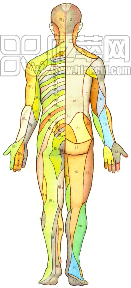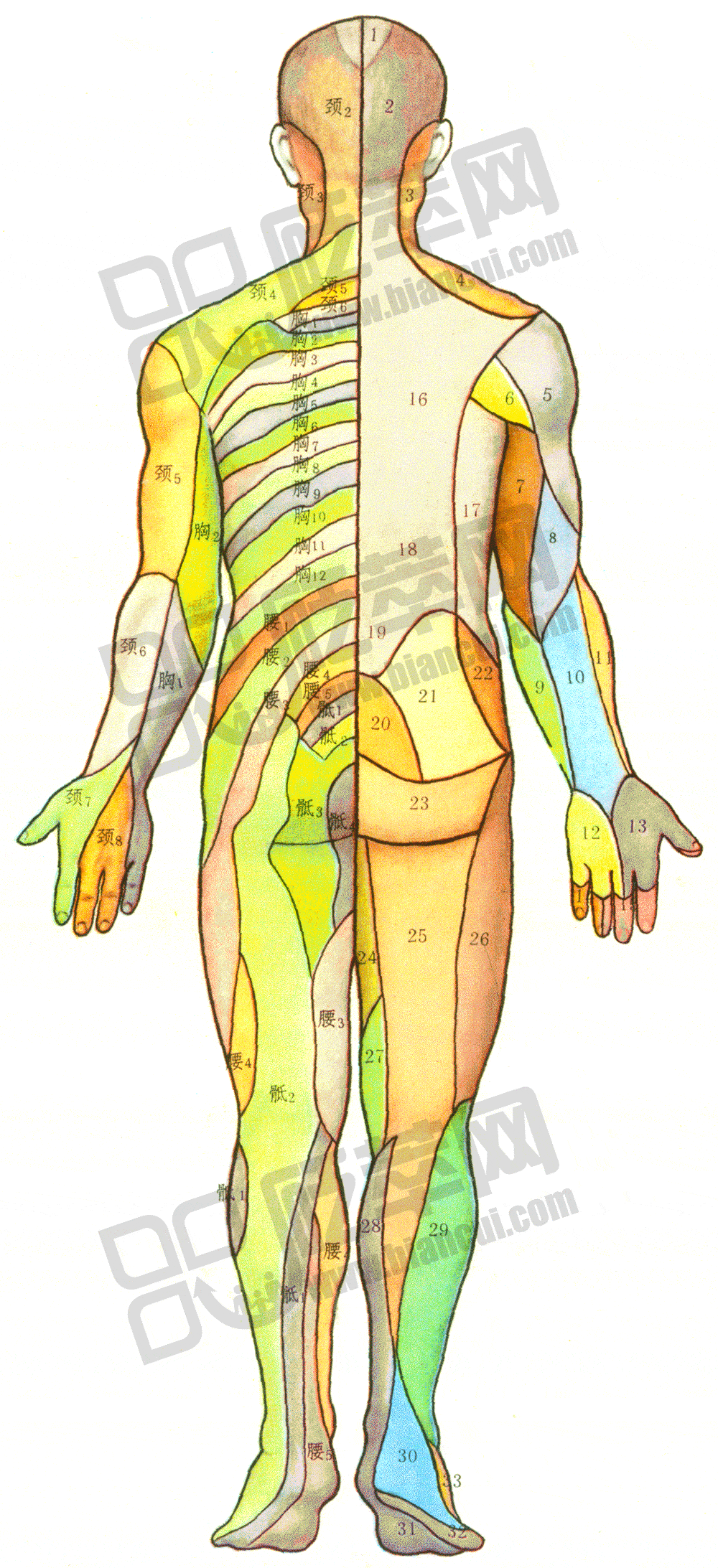 左側(cè)半用不同顏色(相關(guān)鏈接:《砭石的顏色》)標(biāo)示了枕、項(xiàng)、背、腰、骶和上、下肢各部周圍神經(jīng)的節(jié)段性分布。