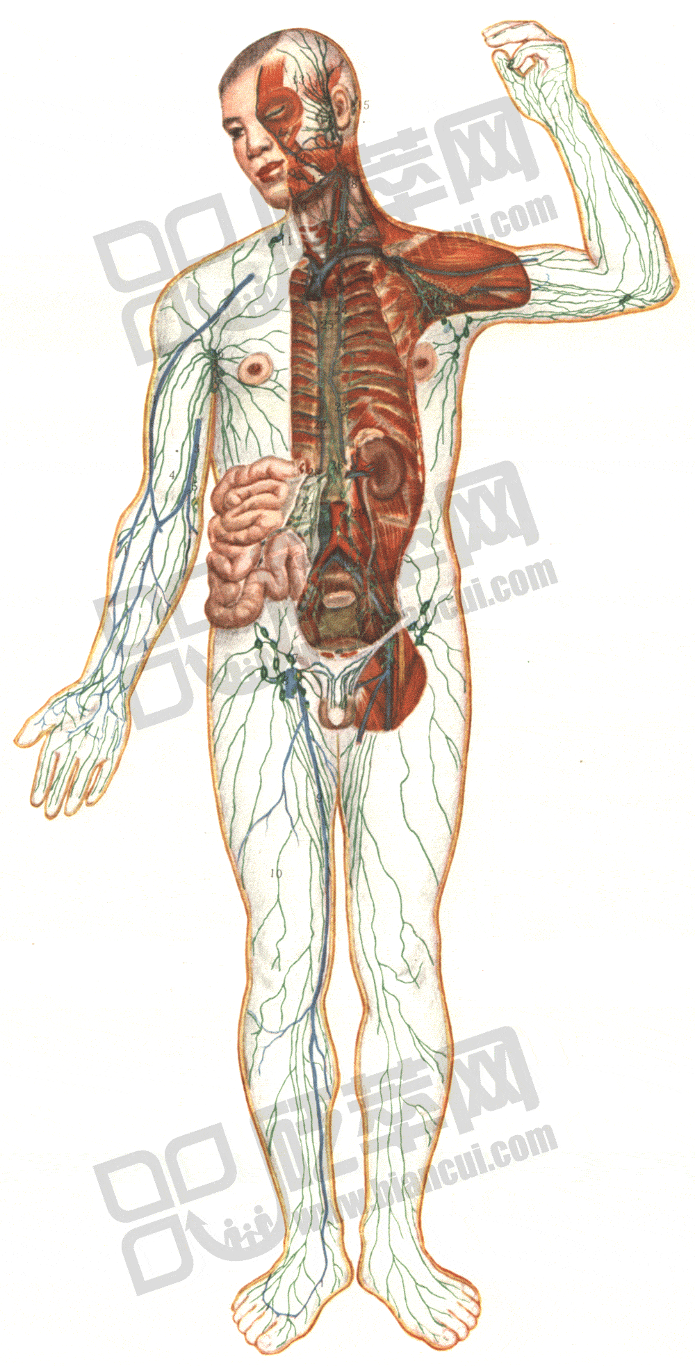 本圖左側半主要顯示上、下肢和頸部的淺淋巴結群。