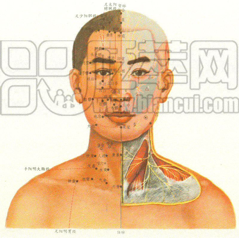 本圖左側半在皮膚上標示了足陽明胃經、足少陽膽經、足太陽膀胱經、手陽明大腸經和任、督兩脈的外行徑路以及與各經脈(砭石使用結合穴位效果更佳,詳情請看砭石養生欄目)相連的穴位(砭石使用結合穴位效果更佳,詳情請看砭石養生欄目)。此外,并選標了一些經外奇穴和新穴。
