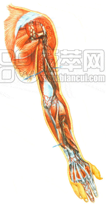 本圖主要顯示上肢后面深層肌、神經和動脈。為了暴露更加清楚,靜脈全部去除。