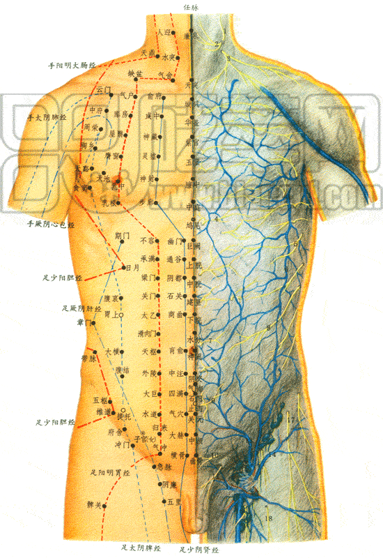 腹正中線腹壁的層次結構,由淺入深為:皮膚、腹淺筋膜、腹白線(組織比較致密,血管神經分布很少)、腹橫筋膜、腹膜外脂肪(臍以上此層不顯著)和腹膜壁層。針刺任脈諸穴時,對此層次應有所了解。