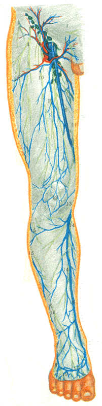 1.髂腹下神經前皮支 6.大隱靜脈 11.閉孔神經皮支 16.腓淺神經