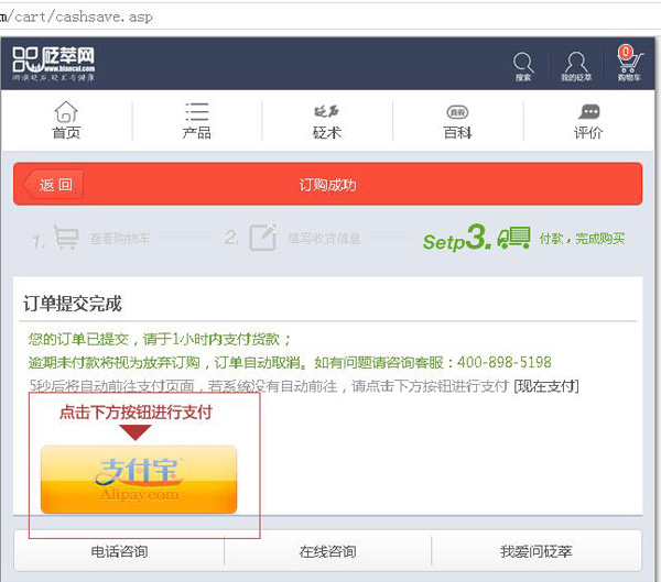 1、訂單提交成功后,點擊下側的支付寶按鈕支付,或者等5秒鐘系統自動跳轉到支付寶官網付款;(見圖3)