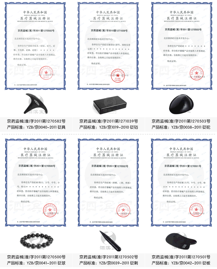 | 1、 | 京藥監械(準)字2014第1270004號 | 北京泗濱砭石技術開發中心 | 砭板 | 大號、中號、小號、特小 |