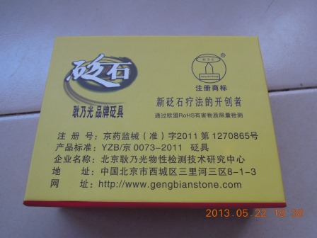 物性檢測表明耿乃光砭石的結(jié)晶顆粒度為0.03毫米,摩擦人體一次產(chǎn)生的超聲波脈沖事件次數(shù)為3708次,遠紅外輻射頻帶波長超過15微米。2000年5月耿乃光教授著書《新砭石療法》來推廣這種古老的綠色療法。目前國內(nèi)外已有多家醫(yī)院應用耿乃光砭石開設砭術(shù)門診。應用耿乃光砭石的新砭石療法療效觀察及評估課題已在國家中醫(yī)藥管理局立項,其中“新砭鐮治療神經(jīng)根型頸椎病的臨床療效觀察及評估課題”和“耿氏新砭石療法治療肩周炎的臨床療效觀察及評估課題”已經(jīng)通過國家中醫(yī)藥管理局鑒定驗收。還通過了歐盟有害物質(zhì)限量質(zhì)令(ROHS-2002/95EC)
