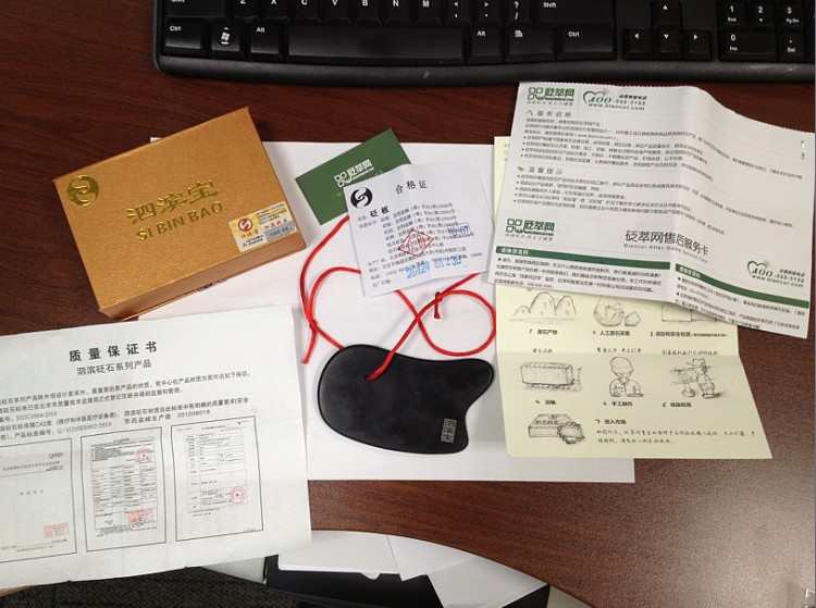 • 泗濱寶砭石刮痧板療效好 曬單心得: 泗濱寶砭石刮痧板,收到貨很滿意,產品檢驗合格證、質量保證書都有,讓我放心了很多,使用了十多天,感覺效果真是不錯耶!刮痧效果好,還能治療頸椎病,上班時間當有頸部酸痛時,將泗濱寶砭石刮痧板用熱水燙一會兒放置肩頸部,真的緩解了我的頸部疼痛!一板多用,真的很贊! 購買時間:2016/4/10