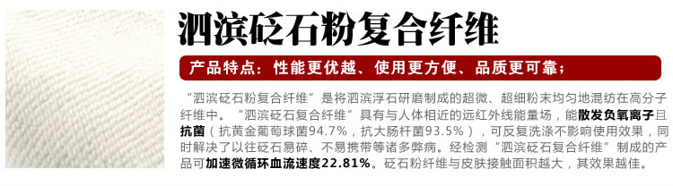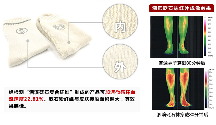 砭石襪是以反射區(qū)原理為依據(jù),運用砭石的遠紅外和超聲波特性研制的砭石養(yǎng)生用品。砭石襪質(zhì)地柔軟、做工精細、通透性強,采用高科技納米技術(shù),將泗濱浮石研磨成超微、超細粉末,均勻地混紡在高分子纖維之中。砭石襪厚實保暖,柔韌性強,與皮膚接觸時,溫熱親和而無刺激感。砭石襪具有遠紅外能量場,并能散發(fā)負氧離子,穿時不僅可以改善腳部微循環(huán),對腳底進行靜態(tài)按摩,還可以通過負氧離子的作用,把氧氣和營養(yǎng)物質(zhì)帶給全身細胞組織,使人體血液流速加快。