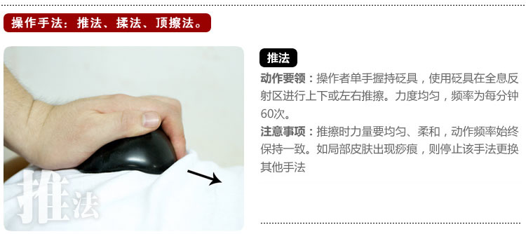 推法:操作者單手握持砭具,使用砭具在全息反射區進行上下或左右推擦。力度均勻,頻率為每分鐘60次。