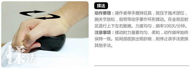 揉法:操作者單手握持砭具,按壓于施術部位,腕關節放松,前臂帶動手掌作環形揉動。在全息反射區進行上下或左右推擦。力度均勻,頻率為每分鐘100次。