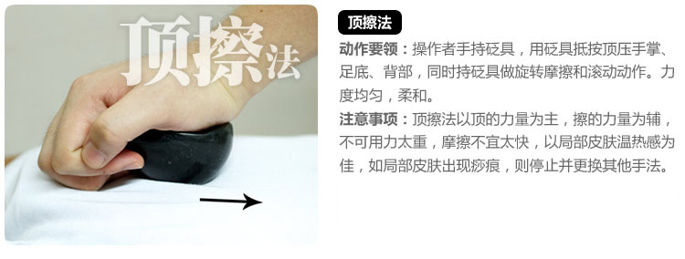 擦法:操作者手持砭具,用砭具抵按頂壓手掌、足底、背部,同時持砭具做旋轉摩擦和滾動動作。