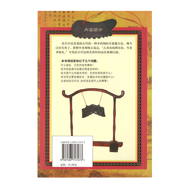 1984年筆者在四川省對(duì)一處石器時(shí)代遺跡進(jìn)行考察時(shí)發(fā)現(xiàn)了一塊砭石,由此引起了對(duì)砭石乃至中醫(yī)一系列基本問題的思考。如什么是完整的中醫(yī)構(gòu)架,它包括哪些主要部分;什么是砭,它的內(nèi)容有哪些;砭術(shù)的起源與發(fā)展過程是怎樣的;砭術(shù)是什么時(shí)候失傳的,失傳的原因是什么;現(xiàn)今有沒有必要發(fā)掘砭術(shù);發(fā)掘砭術(shù)的關(guān)鍵是什么;古老的砭石療法發(fā)掘出來之后如何適應(yīng)現(xiàn)代人的需要等等。這一系列問題構(gòu)成了發(fā)掘與發(fā)展砭石療法的完整的科學(xué)思路。而這一系列問題的解決導(dǎo)致失傳的古砭石療法得以發(fā)掘和適應(yīng)現(xiàn)代人的新砭石療法得以建立。本書將介紹砭石的基礎(chǔ)知識(shí)和新砭石療法的要點(diǎn)。