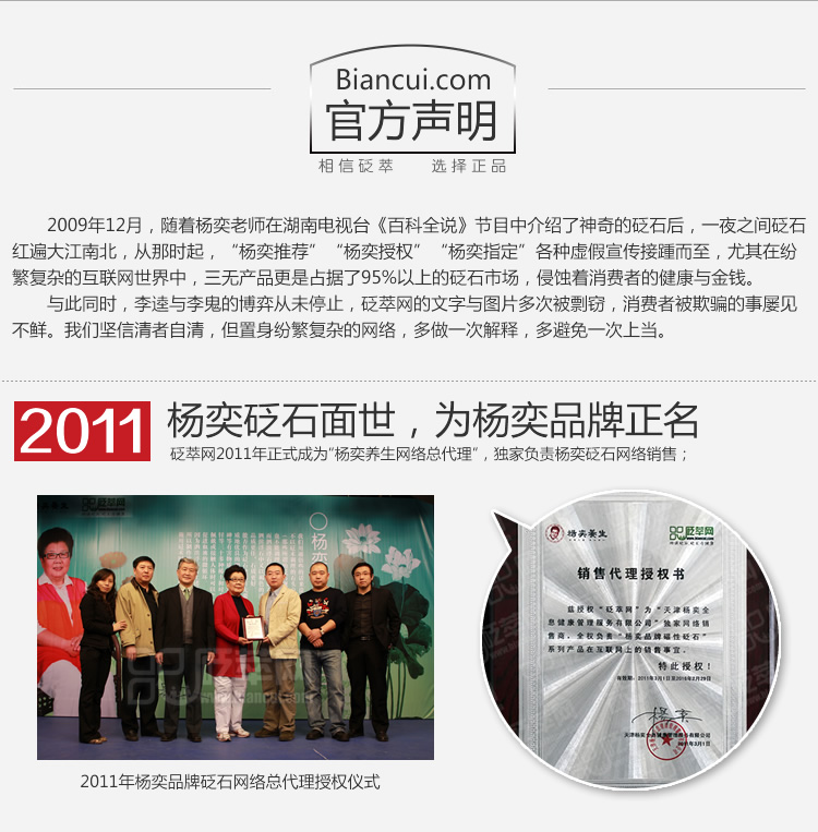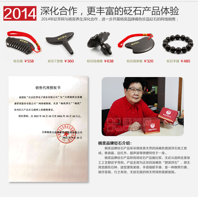 ??? 楊奕品牌砭石系列產品,是楊老師利用泗濱砭石獨有的遠紅外、超聲波特性,以中醫的經絡穴位療法為依據,潛心鉆研而開發出的各種適合現代人自助保健的砭石養生器具及飾品。楊奕砭石精選深褐色泗濱浮石,造型漂亮美觀,手感細膩平滑。憑借多年的砭術治療經驗,楊奕老師深刻理解和體會患者的心情,了解砭石自助保健中可能會遇到的種種問題。為此,楊奕老師特別出版了《手到病自除3》,書中對各種常見病的操作手法做了較為詳盡的解釋。全書以砭石治療的手法演示為主,圖文結合,讓您一看就懂,一學就會。