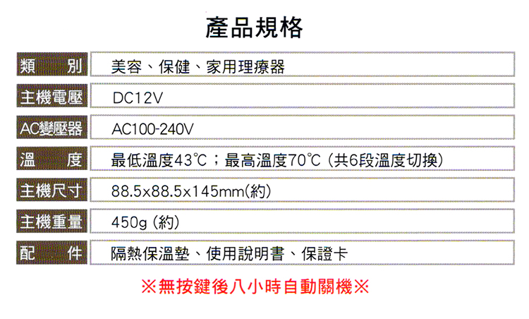 ??? 配件:AC變壓器、使用說明書、保證卡、隔熱保溫墊