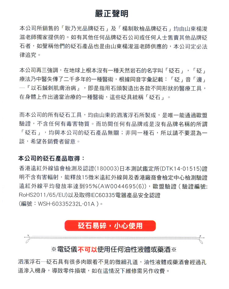 ??? 13、若配合潤膚油使用而有氣味殘留時,可用濕毛巾(請拔下插頭)擦拭砭石表面后再以棉布或棉紙擦干即可。切勿用水侵泡,以免損壞或漏電;