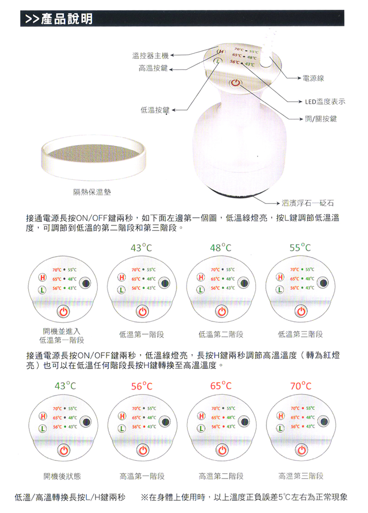 ??? 溫度:最低溫度43℃ 最高溫度70℃ 共6段溫度切換