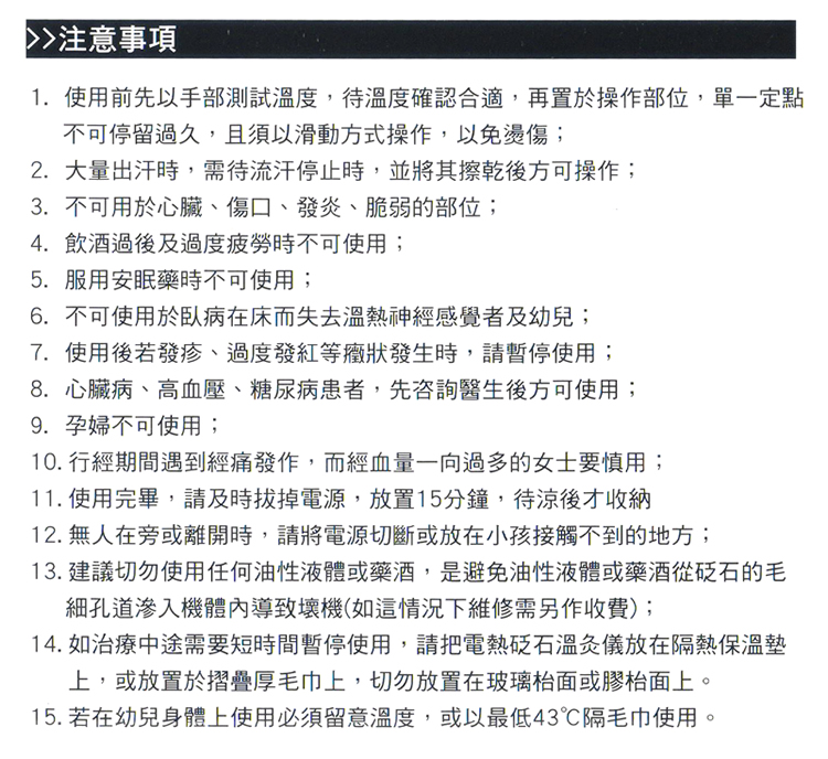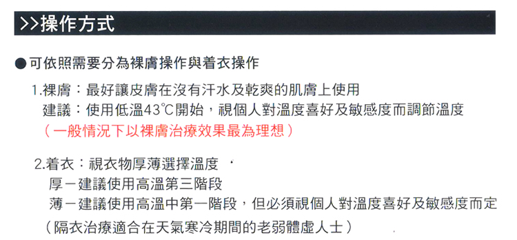 ??? 1、使用前先以手部測試溫度,待溫度確認合適,再置于操作部位,單一定點不可停留過久,且需要以滑動方式操作,以免燙傷;