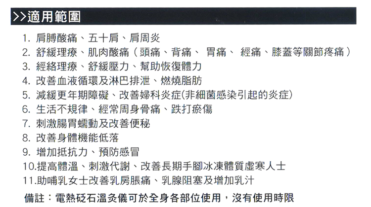 ??? 2、舒緩理療、肌肉酸痛(胃痛、背痛、經痛、關節疼痛);