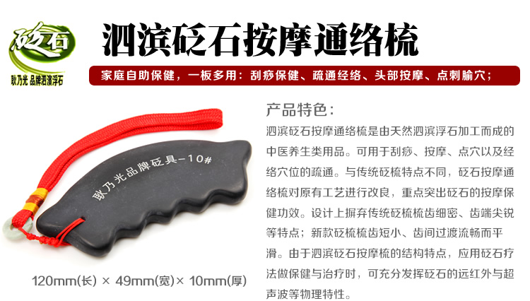 泗濱砭石按摩梳是由天然泗濱浮石加工而成的中醫養生類用品??捎糜诠勿?、按摩、點穴以及經絡穴位的疏通。與傳統砭梳特點不同,砭石按摩梳對原有工藝進行改良,重點突出砭石的按摩保健功效。設計上摒棄傳統砭梳梳齒細密、齒端尖銳等特點;新款砭梳梳齒短小、齒間過渡流暢而平滑。