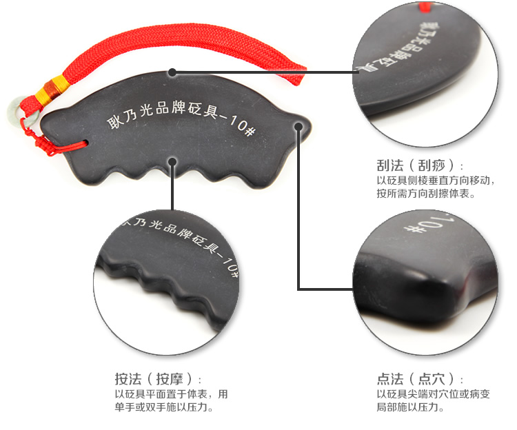1、刮法:以砭具側棱垂直方向移動,按所需方向刮擦體表。