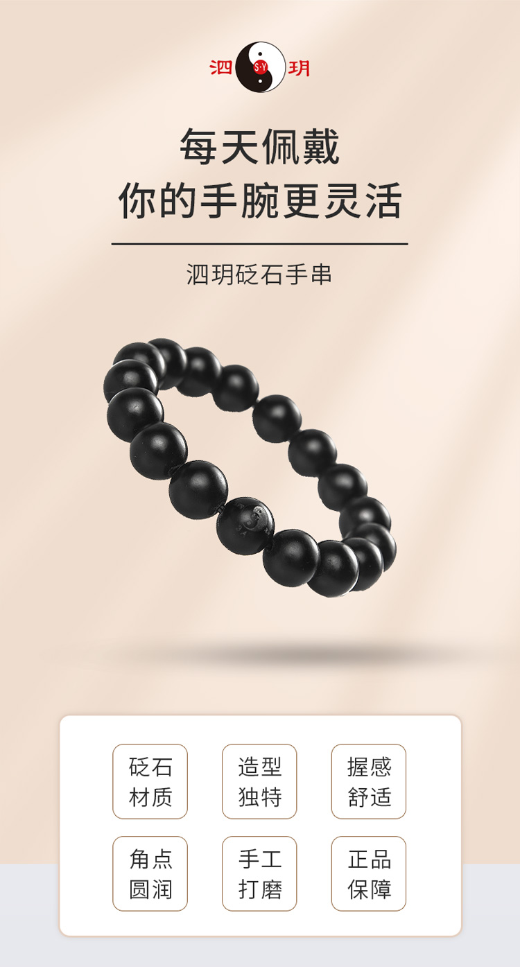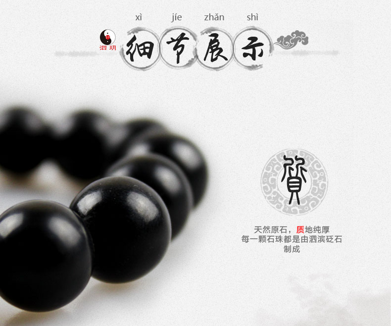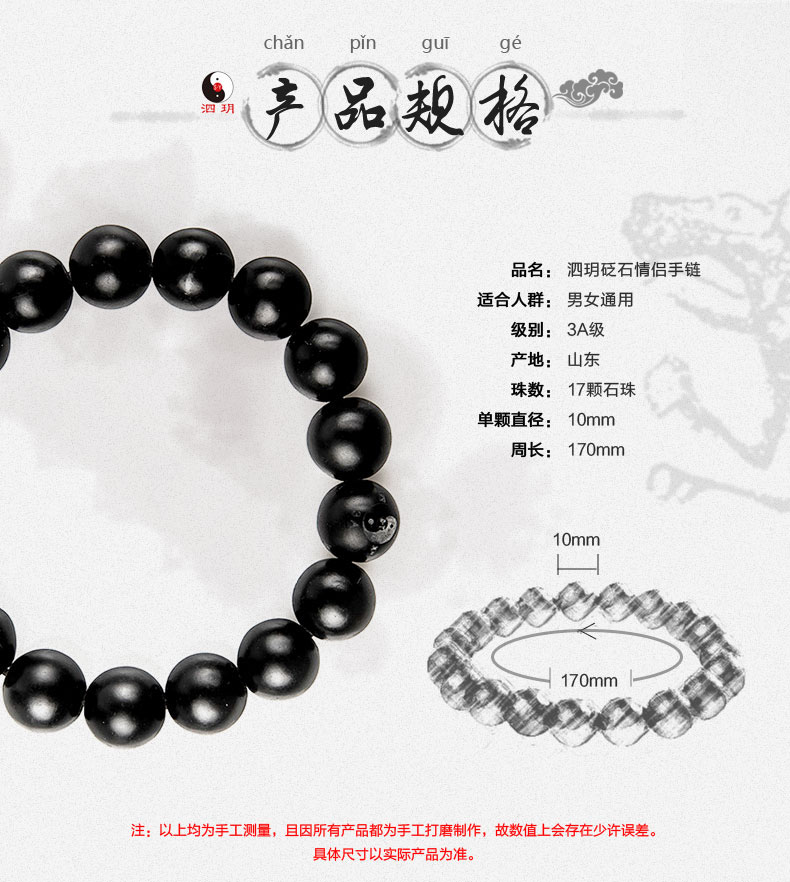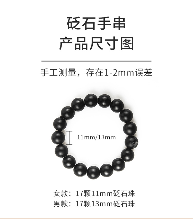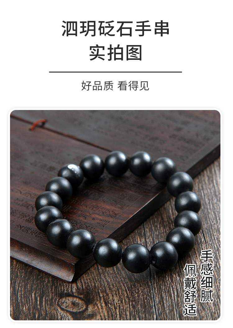 泗濱砭石女手鏈,簡稱砭石手鏈,是由天然泗濱浮石加工而成的養生飾品。其由17顆砭石小圓珠串連而成。砭珠為手工打磨,珠子圓潤飽滿、手感細膩。
