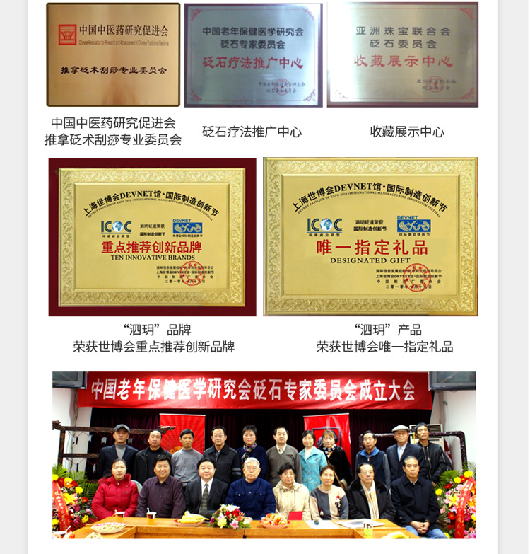 泗玥健康產業源于1987年,歷經二十多年的發展目前已成為一家集砭石原材料采集銷售、中醫砭術調理、美容養生服務、以及砭術師職業培訓為一體的企業。泗玥砭石產品已進駐同仁堂、嘉事堂、華氏大藥房、康復之家等一千多家終端藥房,經營砭石養生館一百六十余家,實現了天貓、淘寶、京東等電子商務平臺全覆蓋模式。2010年上海世博會上,泗玥品牌憑借其產品特點和影響力榮獲大會“重點推薦創新品牌”和“指定禮品”兩項最高大獎。