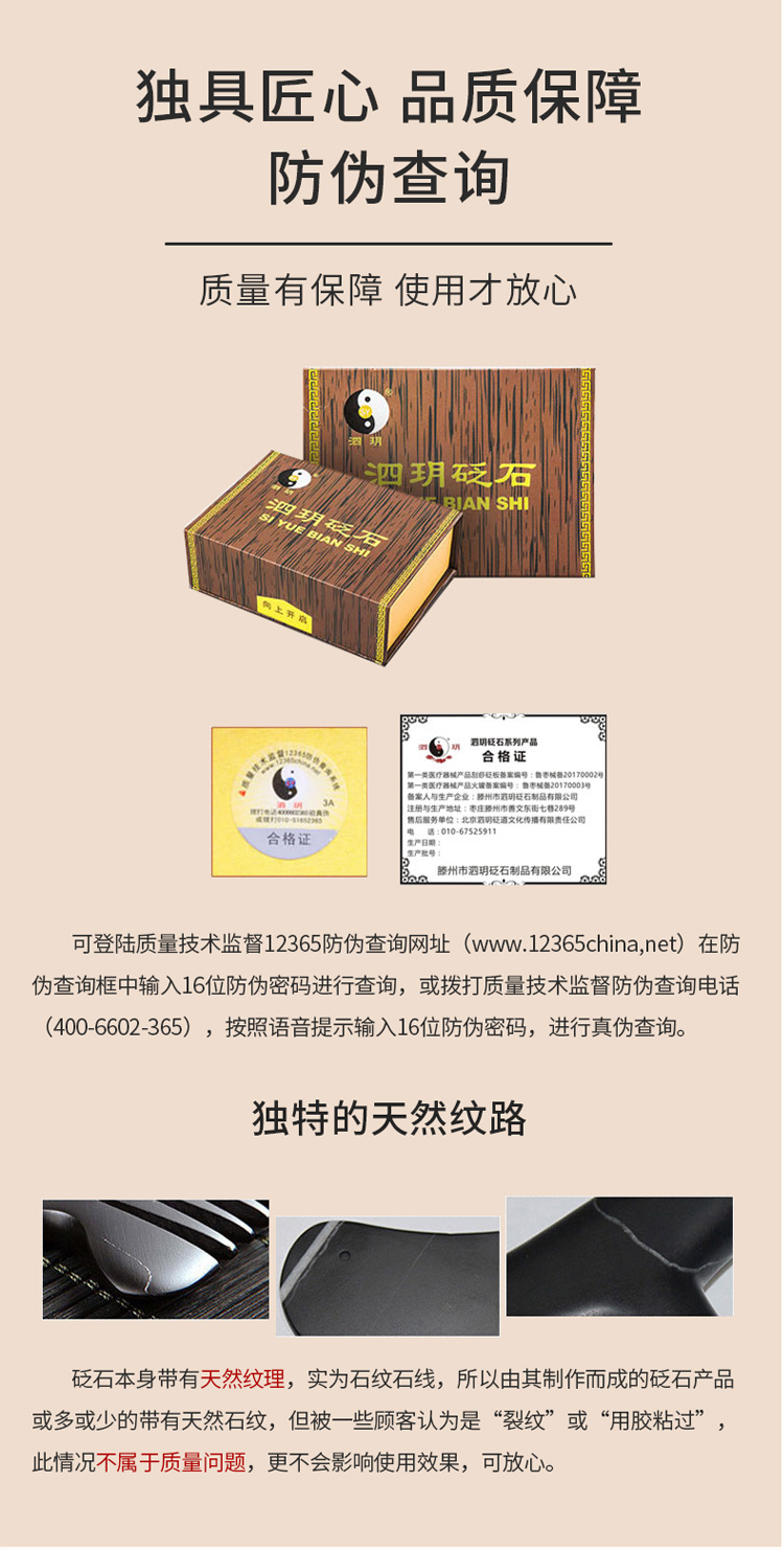 泗濱砭石產品由泗濱浮石制作而成,泗濱浮石本身帶有天然的紋理,所以由其制成的砭石產品也會帶有石紋。通常石紋呈點 、線、條、圓圈狀或以黃斑、石斑樣不規則分布于產品表面。因此天然泗濱砭石產品表面均會存在或多或少的白色或黃色的各式石紋,這屬于正常現象,并不影響使用效果。