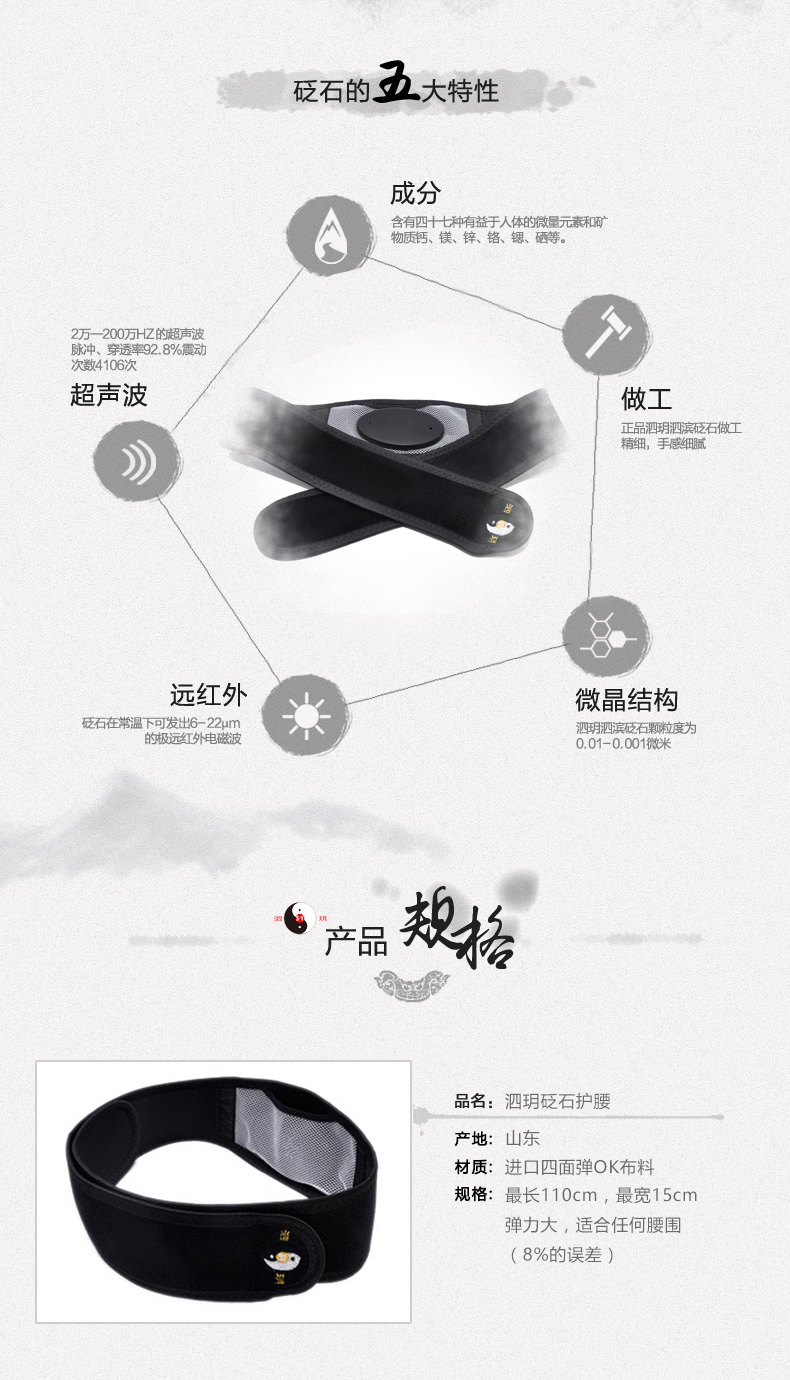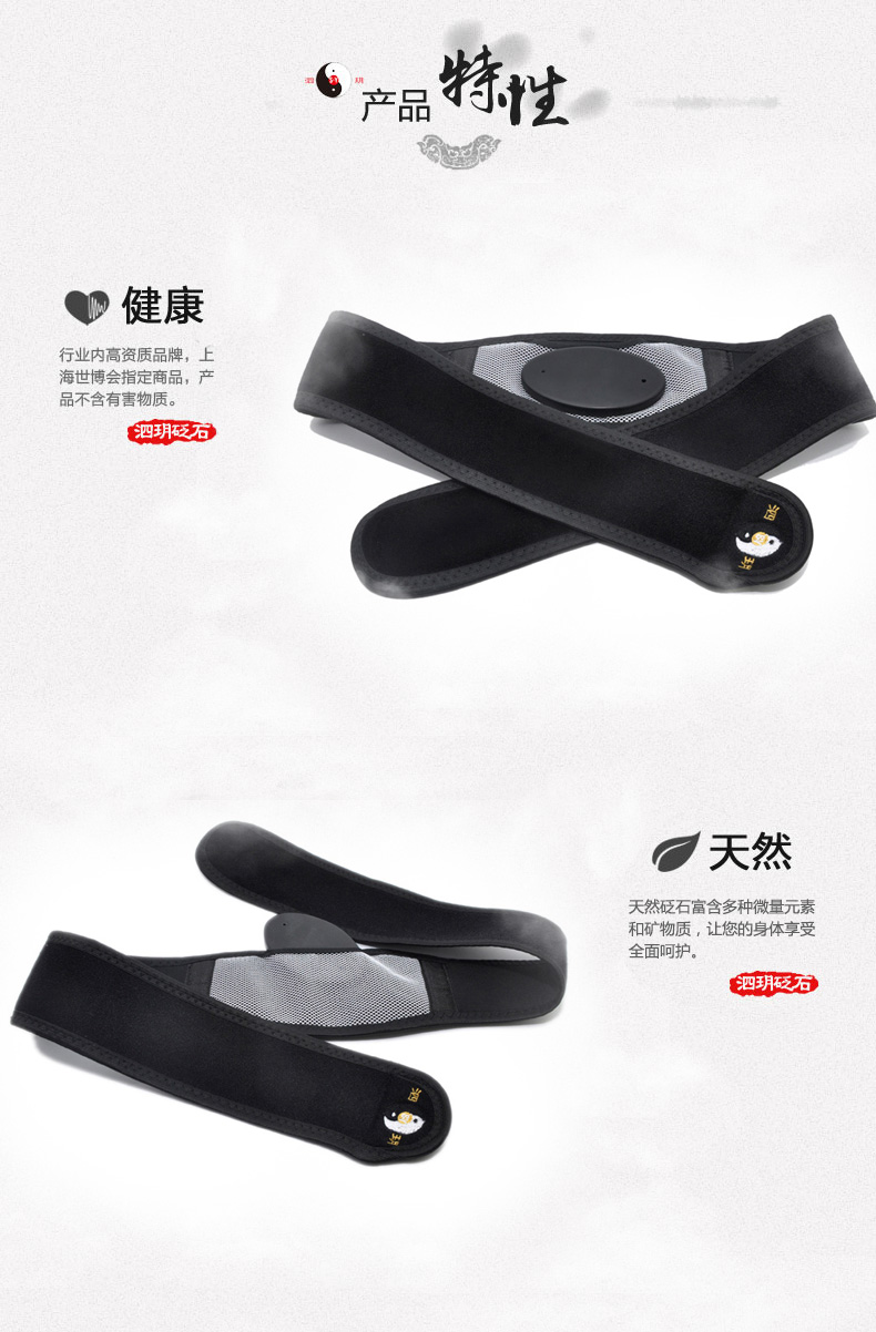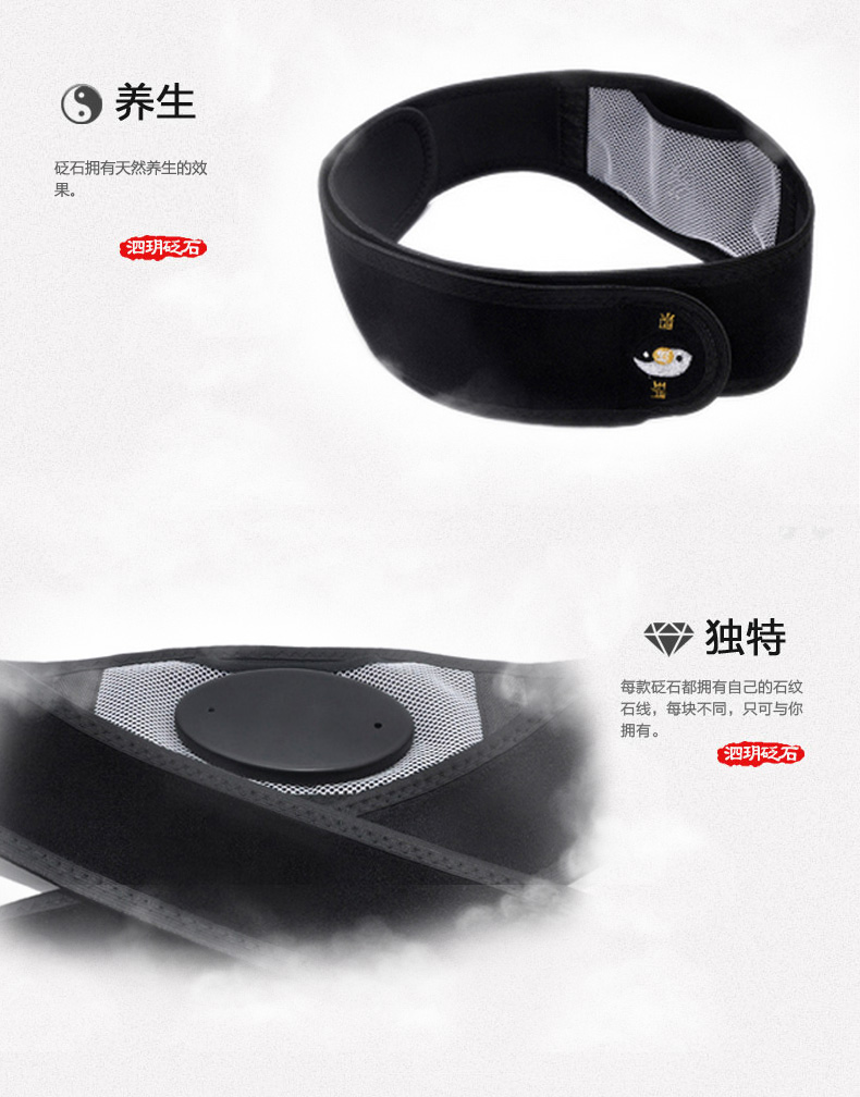 砭石腰帶,又稱砭石護腰,是一種養生用品。構造上由束帶和砭石兩部分組成。其束帶采用四面彈OK布料,彈力大,佩戴舒服,適合任何腰圍人群使用。腰帶中間設有長方形網狀布一塊,內置砭石塊一枚。網狀布透氣性強,穿戴舒適;砭石塊可自由拆卸,利于腰帶的清洗和保養。