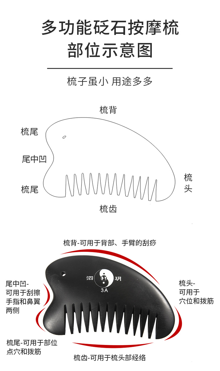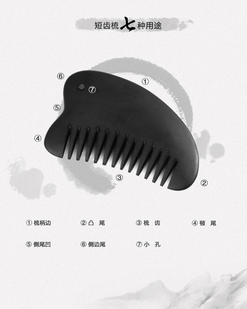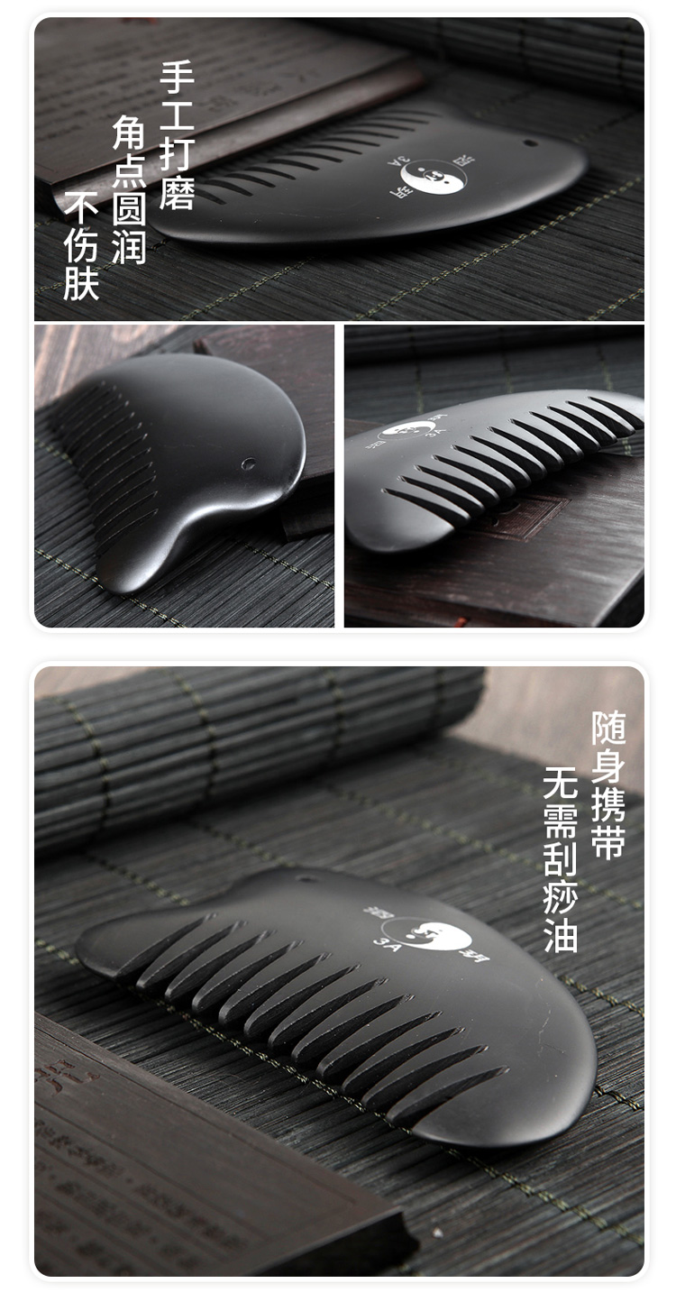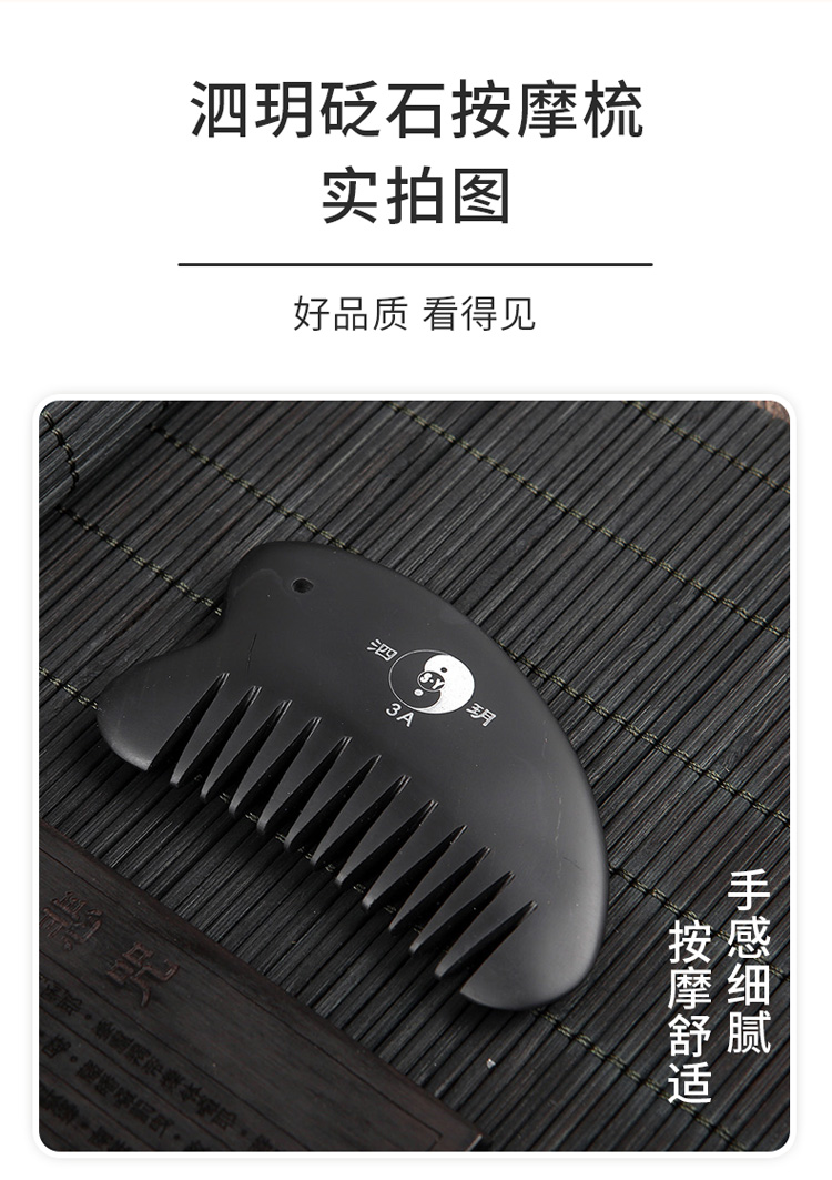 2、砭梳齒邊可用于頭部、胸部以及經(jīng)絡(luò)處的點按和疏通。梳理時,速度宜緩,可一邊梳理一邊施力。