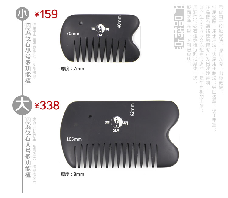 泗玥泗濱砭石多功能梳小號SY-16梳S(長70mm × 寬40mm× 高7mm)。本品是泗玥品牌的優質砭石養生用品。泗玥泗濱砭石多功能梳小號在砭萃網上累計銷售177件,在所有砭萃網的會員中,有43.4% 的客戶選擇購買本產品,在所有購買用戶中100.0%的用戶給予好評。砭萃網為您提供泗玥泗濱砭石多功能梳小號的全面信息,包括泗玥泗濱砭石多功能梳小號的品牌介紹、作用功效、檢測報告、用戶評價、使用方法及注意事項。