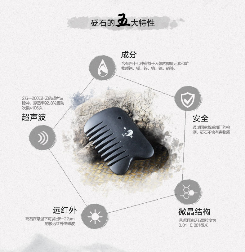 人體頭部分布著6條經脈的48個穴位,使用砭梳不間斷地刺激頭部,砭石與頭皮形成磨擦,產生強滲透力的超聲波脈沖和遠紅外效應,則局部氣血循環加快。
