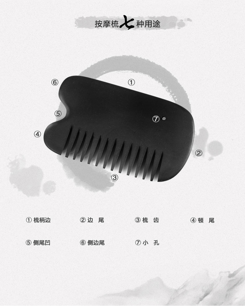 砭石多功能梳:梳齒常用于頭部、頸部、胸部及四肢等部位經(jīng)絡(luò)的劃法。梳背可在頭部、頸肩部施刮法。