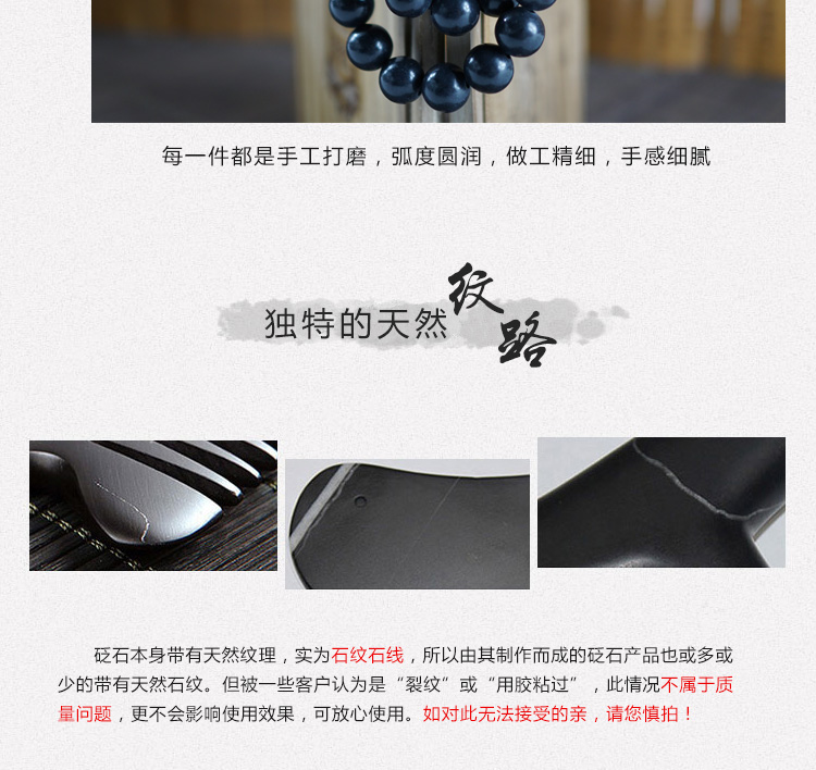 泗濱砭石產品由泗濱浮石制作而成,泗濱浮石本身帶有天然的紋理,所以由其制成的砭石產品也會帶有石紋。通常石紋呈點 、線、條、圓圈狀或以黃斑、石斑樣不規則分布于產品表面。因此天然泗濱砭石產品表面均會存在或多或少的白色或黃色的各式石紋,這屬于正常現象,并不影響使用效果。