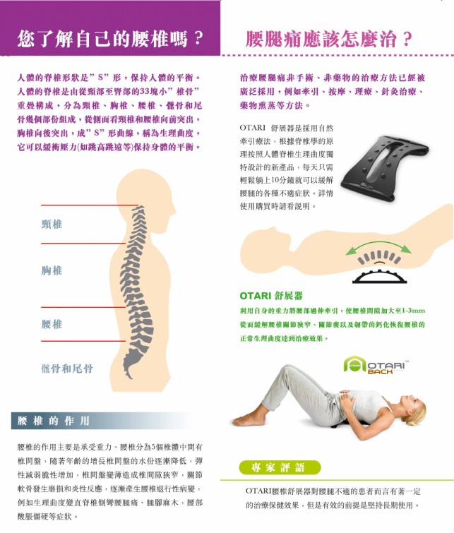 According to statistics, 70% of the people who walk, stand, sit in the wrong position for a long time, and physical labors and drivers, more or less have some forms of lumbar spondylopathies. If the back is under high or extreme pressure for an extended time, it is prone to develop lumbar spondylopathies, such as the straightened physio-curve, slipped disc, narrowed disc space and muscle strain, etc. The symptoms are sore back, back pain, sciatica, etc. The OTARI Back Stretcher is designed based on the theories of kinetics. It is a safe, practical and easy to use family physical exercising device and has significant effect on improving various kinds of back and leg discomfort. The weight of the human body is used in the mechanism of the Stretcher to create a soft traction on the back when it is at its normal physio-curve to maintain the healthy condition of the back. The space between the discs is slowly stretched in order to heal spondylopathies and relieve sore back and back pain. At the same time, the massage points on the Stretcher can stimulate respective points on the body in order to achieve healing and revitalizing effects. It is a health device for any modern household.