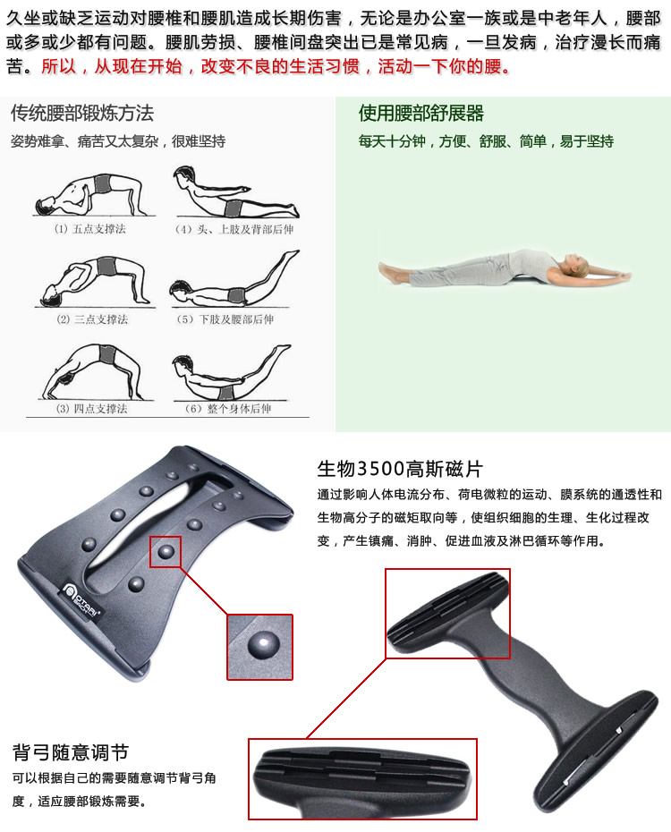 腰椎舒展器:舒緩腰椎疼痛、牽引、恢復(fù)人體的正常生理曲度S型、塑身美體瘦身,同時(shí)按摩點(diǎn)接觸身體幫助血液循環(huán),促進(jìn)新陳代謝,緩解輔助治療腰椎疾病。5-15份鐘效果顯著。針對人群:白領(lǐng)、司機(jī)、長時(shí)間站立、久坐、長時(shí)間對著電腦等人士.