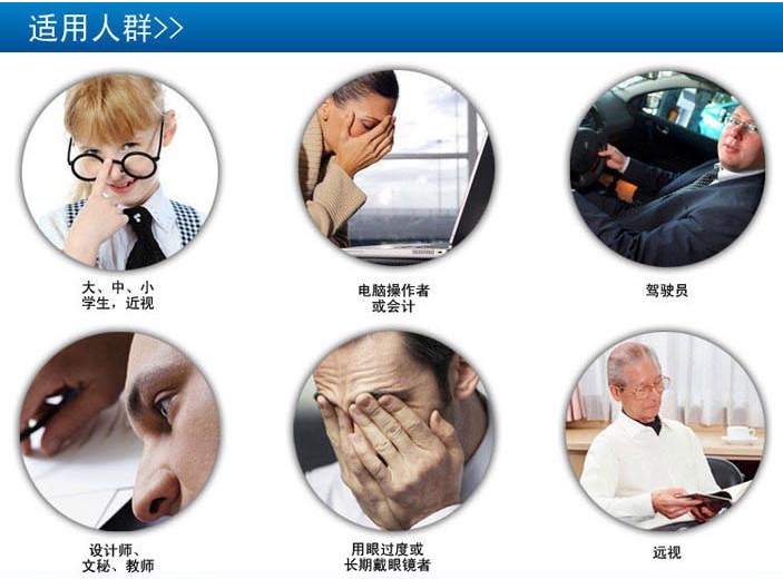 1、大中小學生近視、遠視、弱視、用眼過度及長時間戴眼鏡引起的眼睛不適。