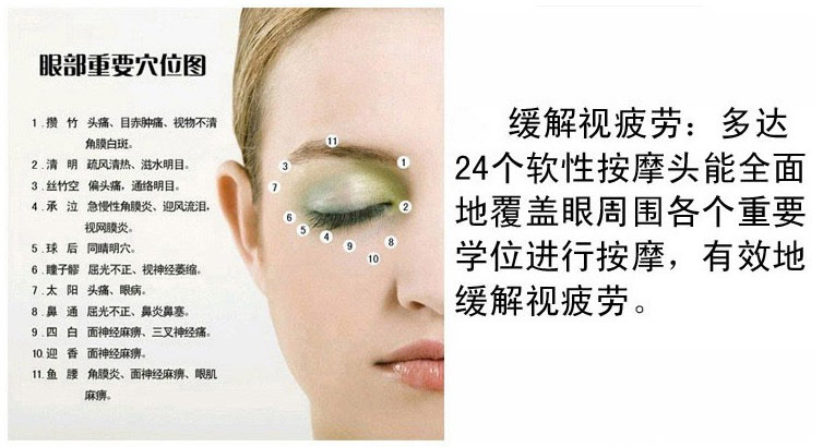 可使眼球與眼肌充分放松,降低眼內(nèi)壓,消除用眼過度引起的酸脹,腫痛,干澀,怕光及視物模糊等癥狀。高頻磁場,多頻振動,按摩穴位